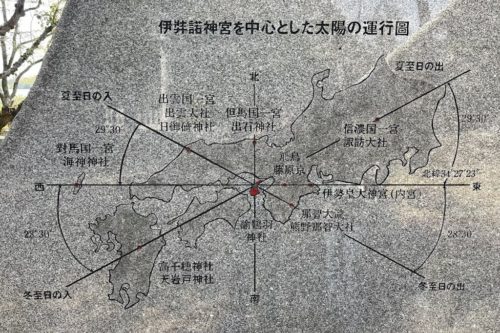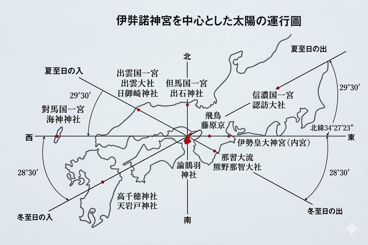 出雲大社や伊勢神宮など重要な神社と太陽の運行が重なっている。